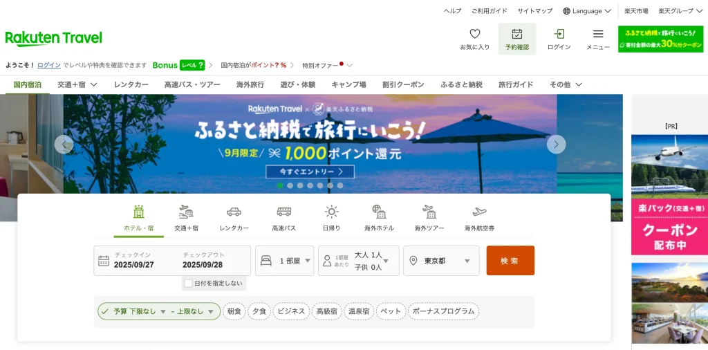 楽天グループが運営する日本最大のOTA(オンライン旅行代理店)。最大の武器は、なんといっても「楽天ポイント」との強力な連携です。楽天市場など、楽天経済圏で貯めたポイントを旅行代金に充当でき、旅行でさらにポイントが貯まるというサイクルは、楽天ユーザーにとって非常に魅力的です 。国内の宿泊施設登録数は業界トップクラスで、ビジネスホテルから温泉旅館まで、あらゆるニーズに応える盤石の体制を誇ります。