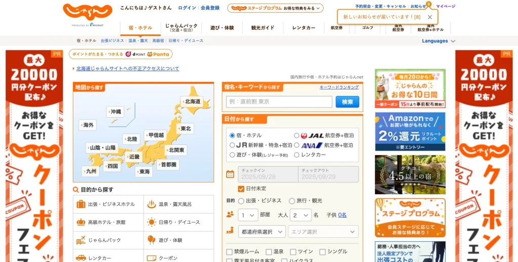 リクルートが運営する、楽天トラベルと並ぶ国内OTAの雄 。旅行情報誌「じゃらん」を母体とするだけあり、特に温泉旅館や地方の宿に関する情報が豊富です。じゃらんnetの最大の特徴は、