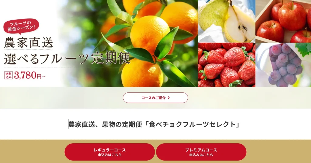 | こんな人におすすめ | 品質・安心・自由度を求める全ての人 | 身近な果物を楽しみたい人 | 選ぶのが面倒な人 | 特別な贈答品を探す人 | 長期利用が前提の人 |