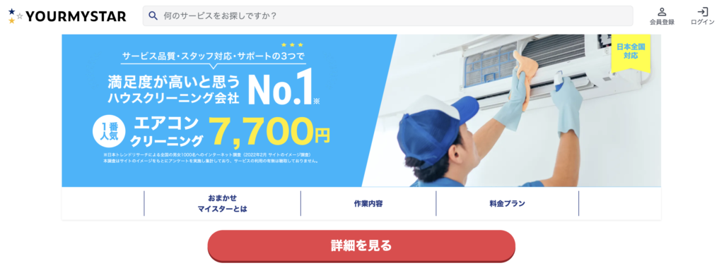 | YOURMYSTAR | 約8,000円~ | エアコンクリーニング、キッチン・浴室清掃、換気扇清掃 | 優秀 | 4.5 | プロマッチング、充実したレビューシステム | 日本全国 |